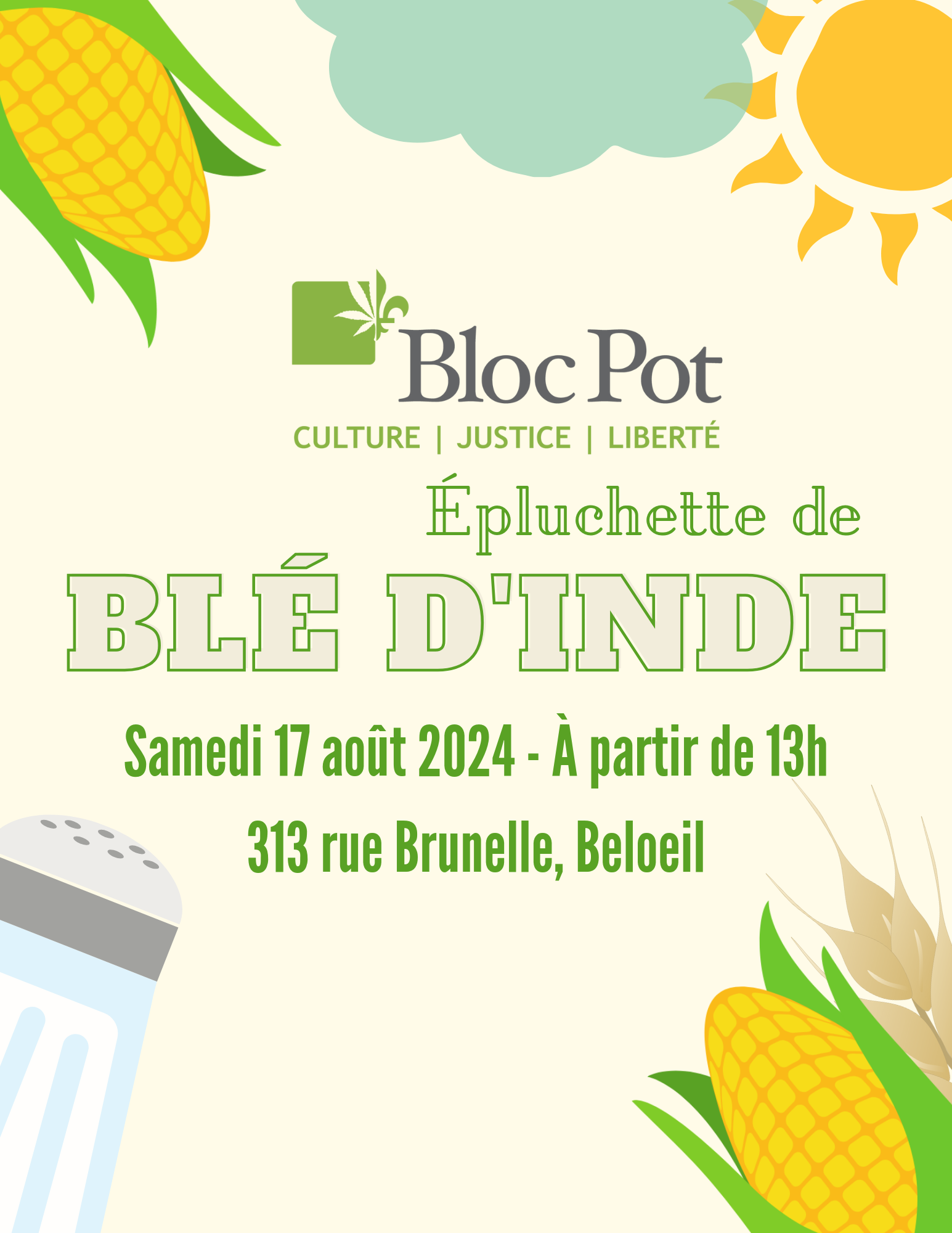 Samedi le 17 août à partir de 13h, épluchette de blé d'inde au siège social du Bloc Pot situé au 313 Rue Brunelle, Beloeil J3G 2M9.